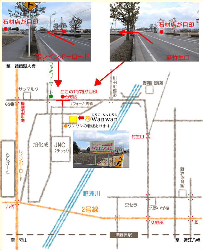 | アクセス | ・2号線守山方面→「八代交差点」左折。ららぽーとさんを過ぎ、サンマルクさんのある播磨田町南交差点を右折 ・2号線近江今津→「北」、「久野部」交差点右折。北野小学校~竹生口~野洲川を越えてすぐ |